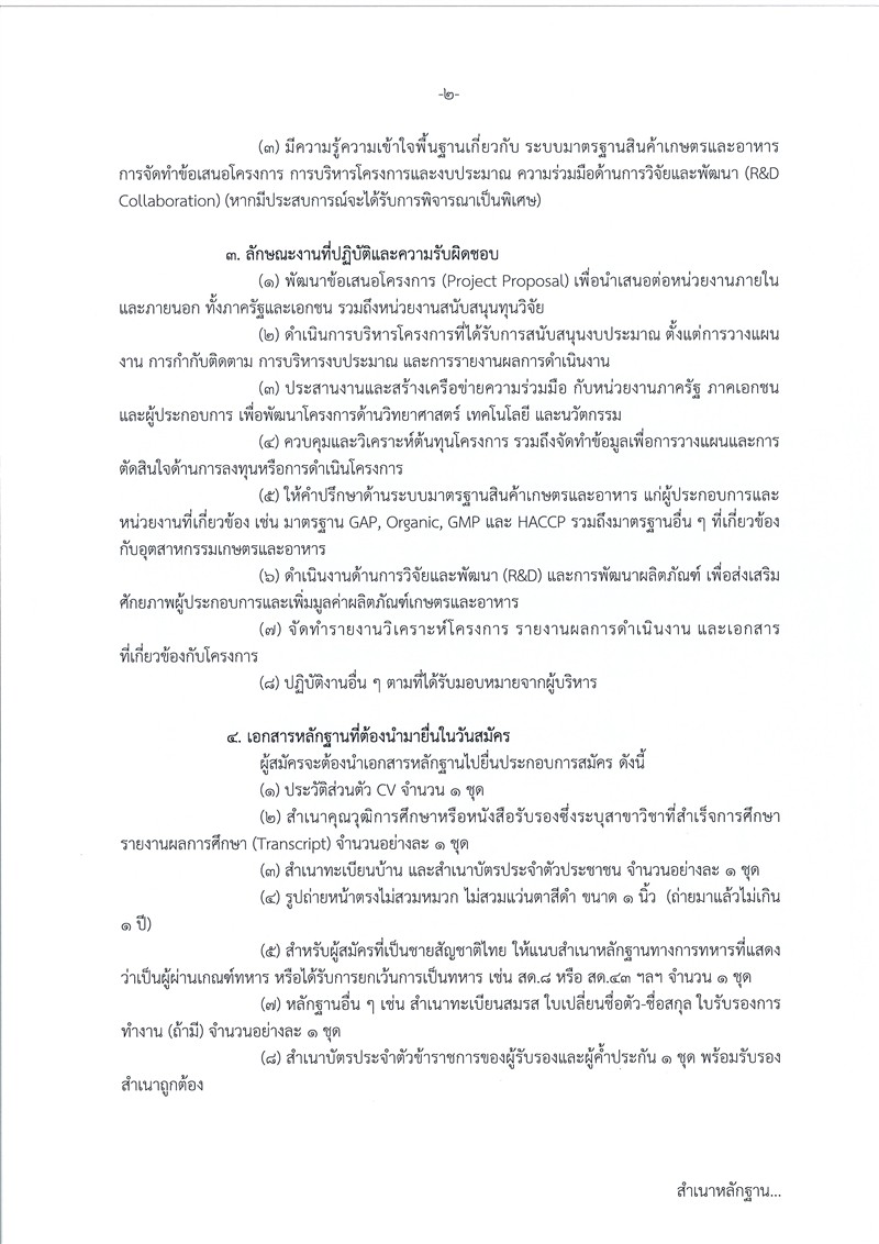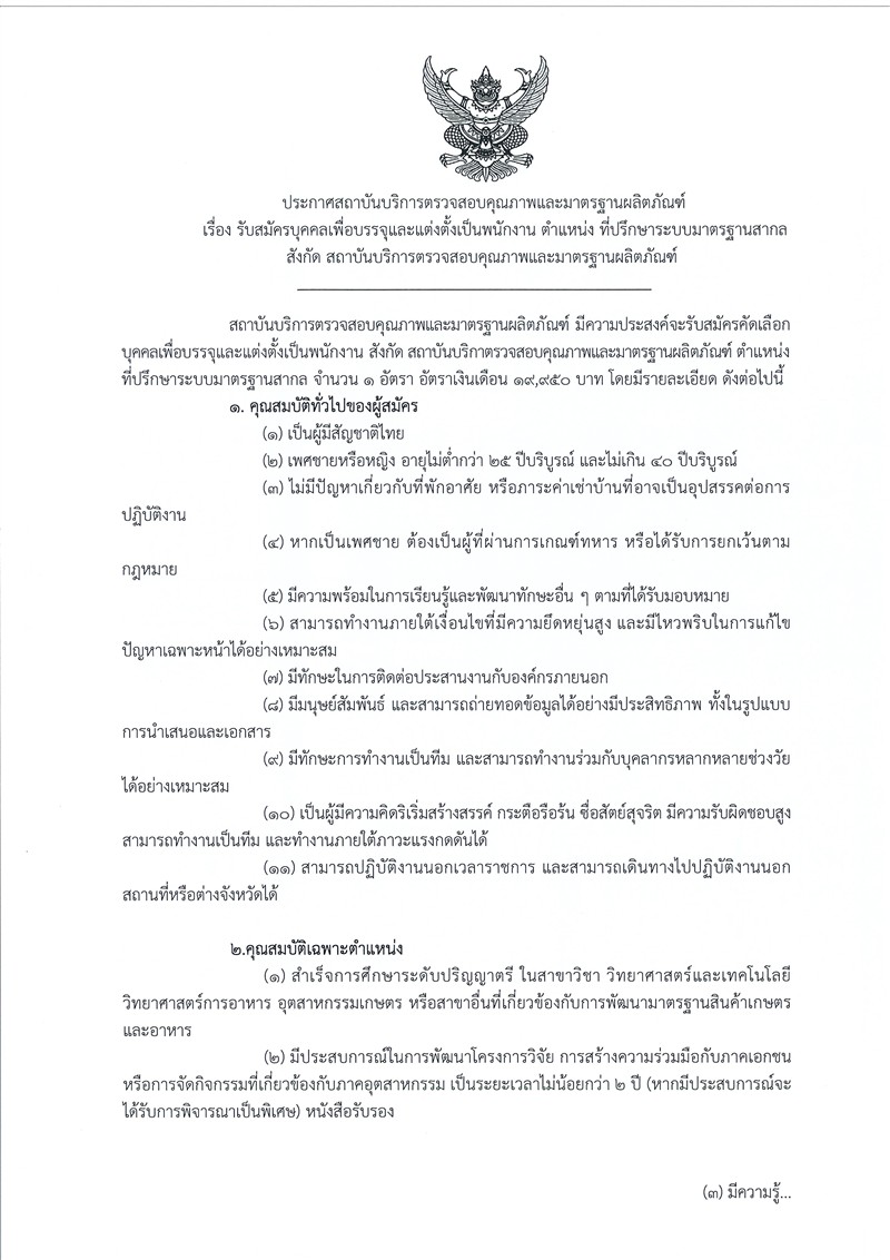 ผู้สมัครต้องมีสัญชาติไทย อายุ 25–40 ปี สำเร็จการศึกษาระดับปริญญาตรีด้านที่เกี่ยวข้องกับวิทยาศาสตร์/อุตสาหกรรมเกษตร มีทักษะการประสานงาน การทำงานเป็นทีม และมีความรู้ด้านมาตรฐานสินค้าเกษตรและอาหาร (เช่น GAP, GMP, HACCP) หากมีประสบการณ์จะพิจารณาเป็นพิเศษ